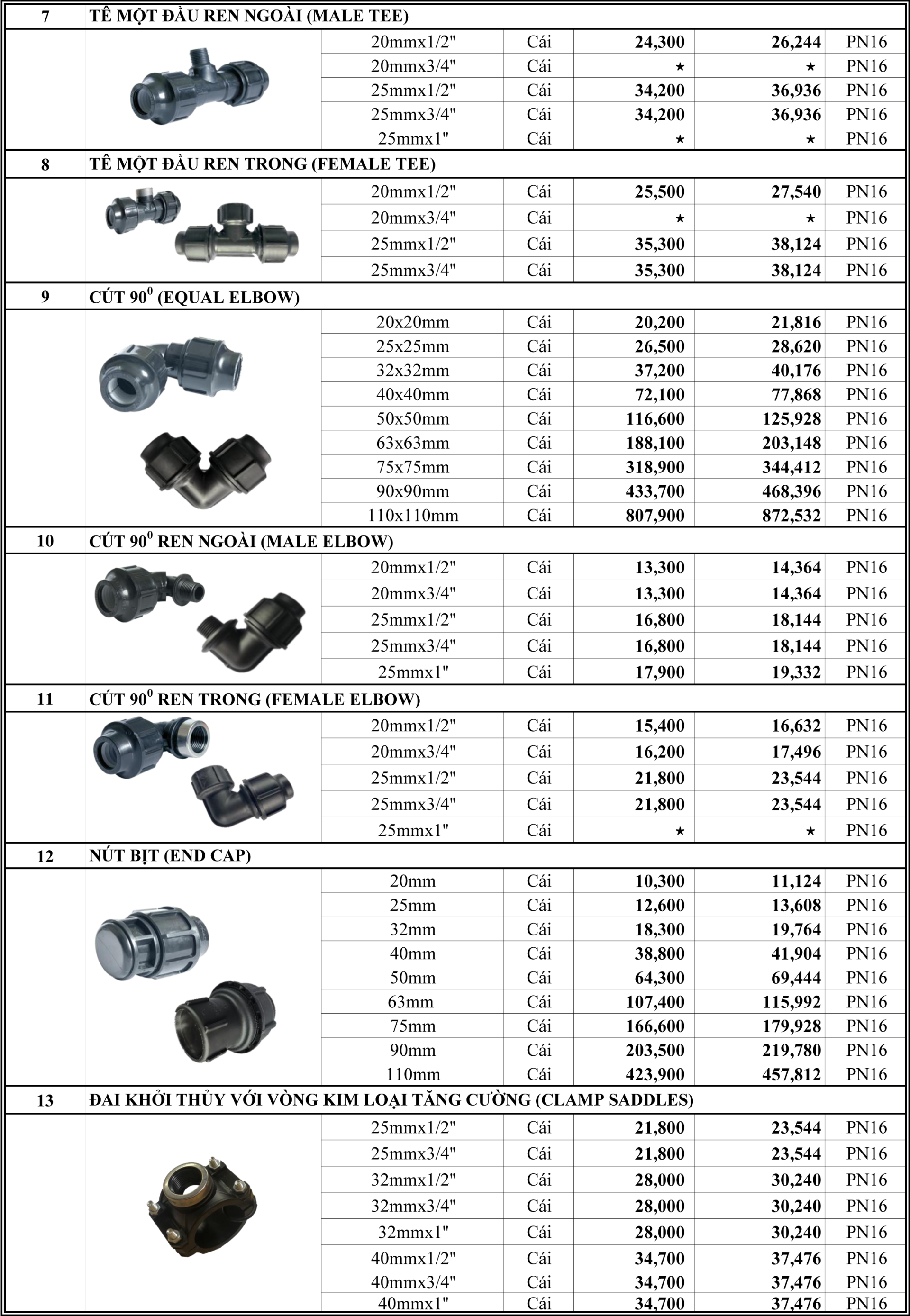 Bảng giá các sản phẩm khác (măng sông, tê, cút, đai khởi thủy....)